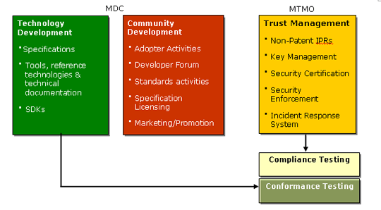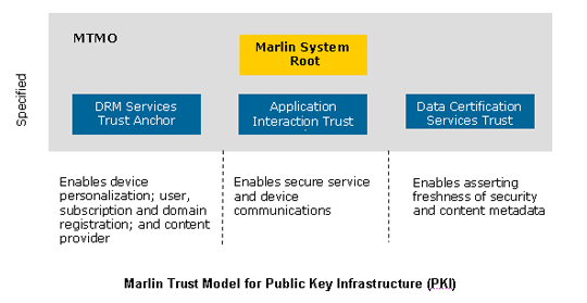 The MTMO provides a single trust management infrastructure that ensures interoperability between Marlin-compliant products and services. This allows renewable security to be implemented with minimum impact to consumers, client and service providers.